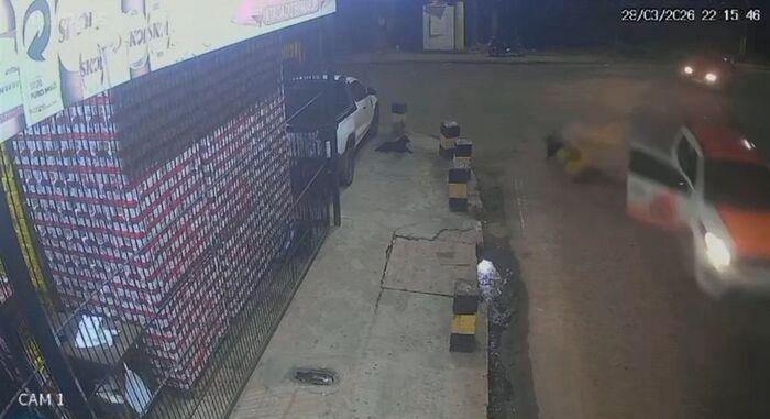 Câmeras de segurança flagraram o momento em que a porta de um carro em movimento se abre e uma mulher é lançada para fora, caindo e rolando pelo asfalto até parar na calçada.