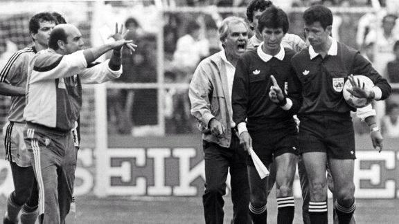 Evaristo de Macedo discutindo com o juiz após lance polêmico na Copa do Mundo de 1986. (Foto: Reprodução)