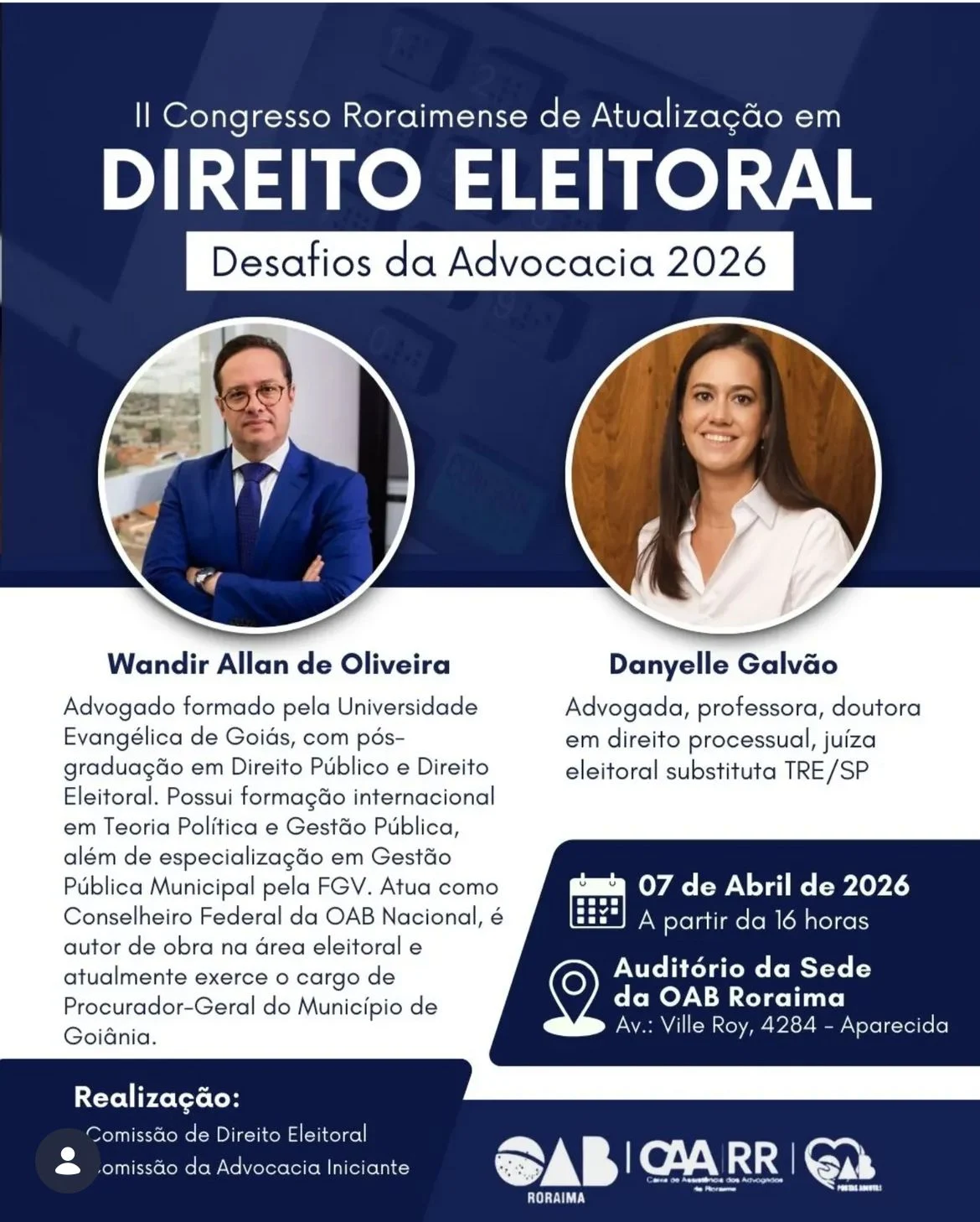 A Ordem dos Advogados do Brasil – Seccional Roraima (OAB-RR), promove nesta terça-feira, 7 de abril, a partir das 16h, no Auditório Hermone Saraiva Grangeiro, o I Congresso Roraimense de Atualização em Direito Eleitoral: Desafios da Advocacia 2026.