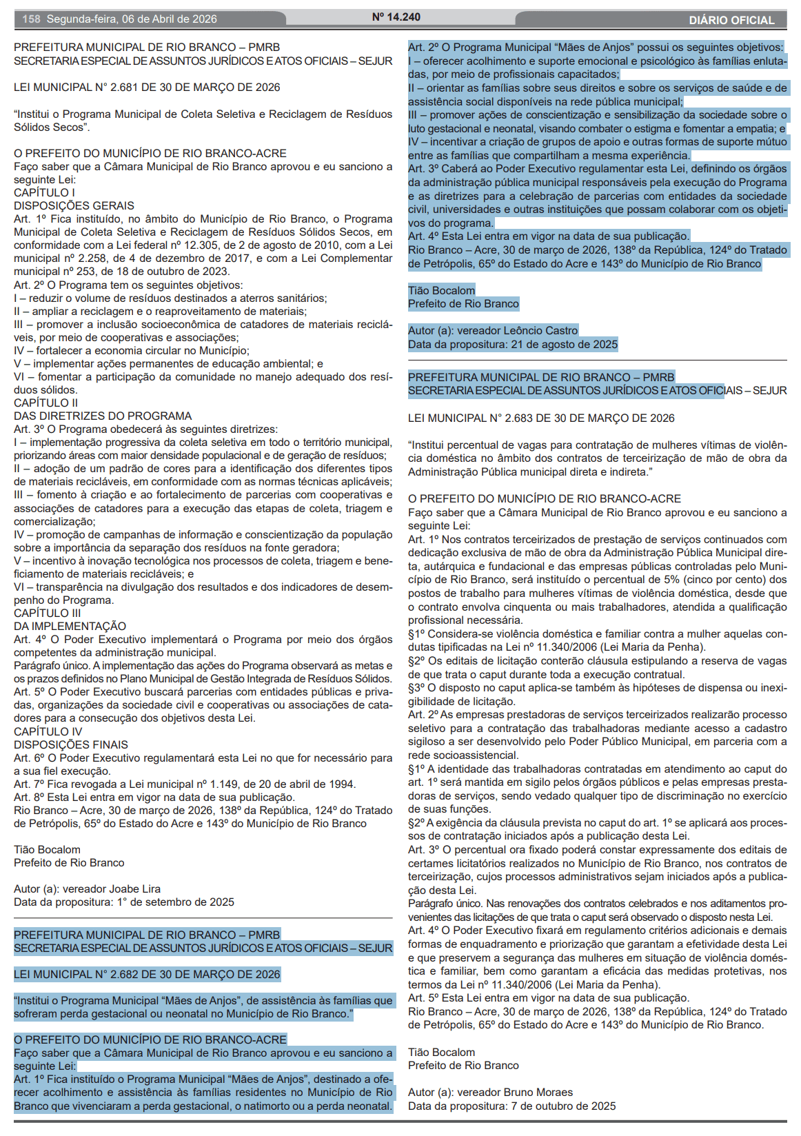 Famílias que enfrentam a perda gestacional, natimortos ou mortes neonatais passam a contar com uma política pública específica em Rio Branco. A criação do Programa Municipal “Mães de Anjos” foi oficializada na edição desta segunda-feira, 6, do Diário Oficial do Estado (DOE), por meio da Lei nº 2.682/2026.