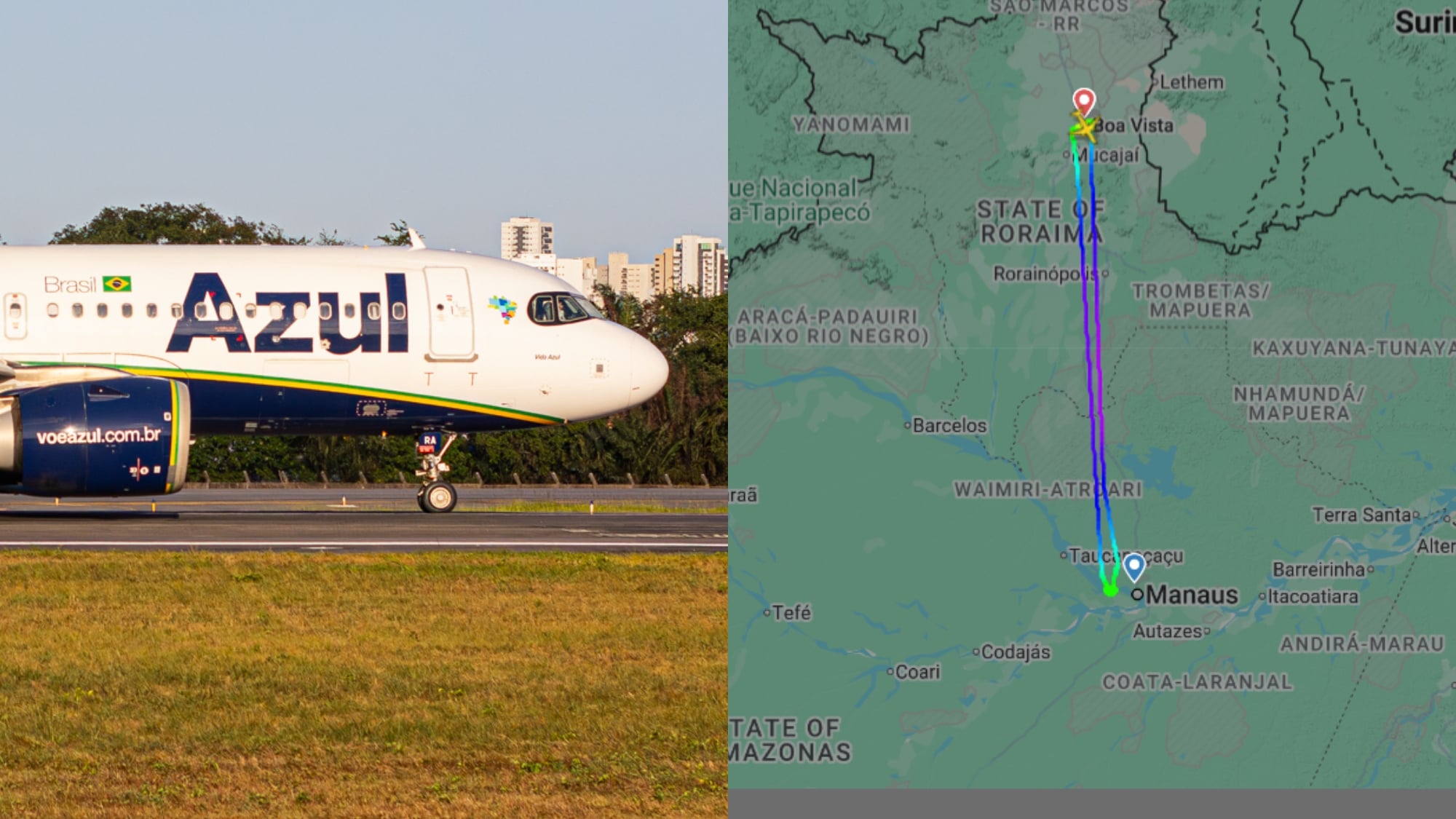 A aeronave, um Airbus A320-251N, decolou do Aeroporto Internacional Atlas Cantanhedes, na capital roraimense, às 14h15 e chegou ao espaço aéreo de Manaus por volta das 15h14.