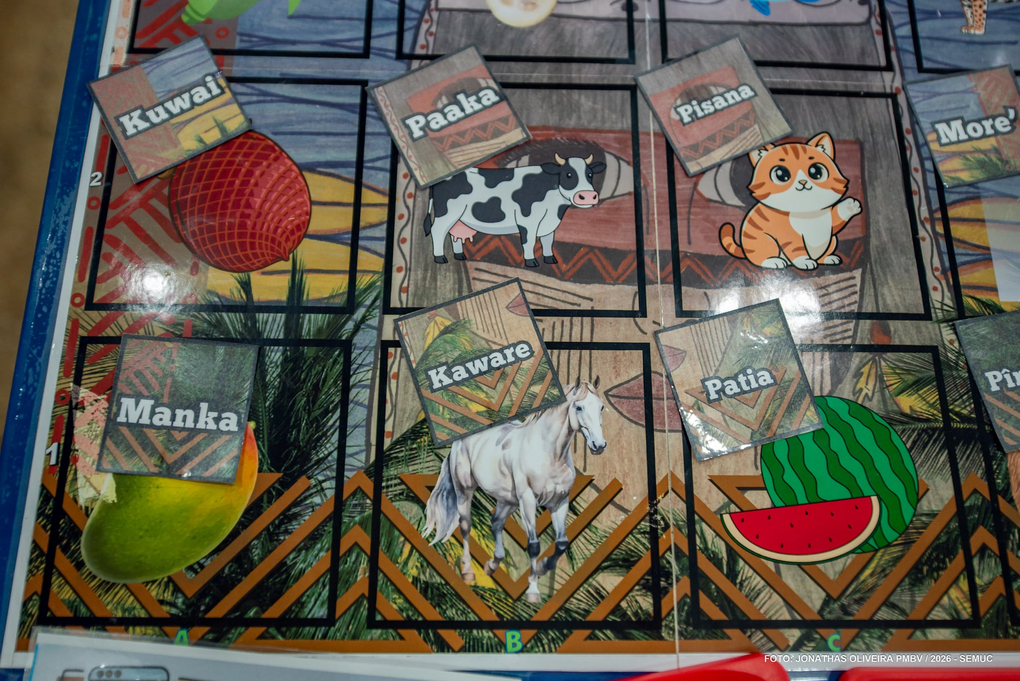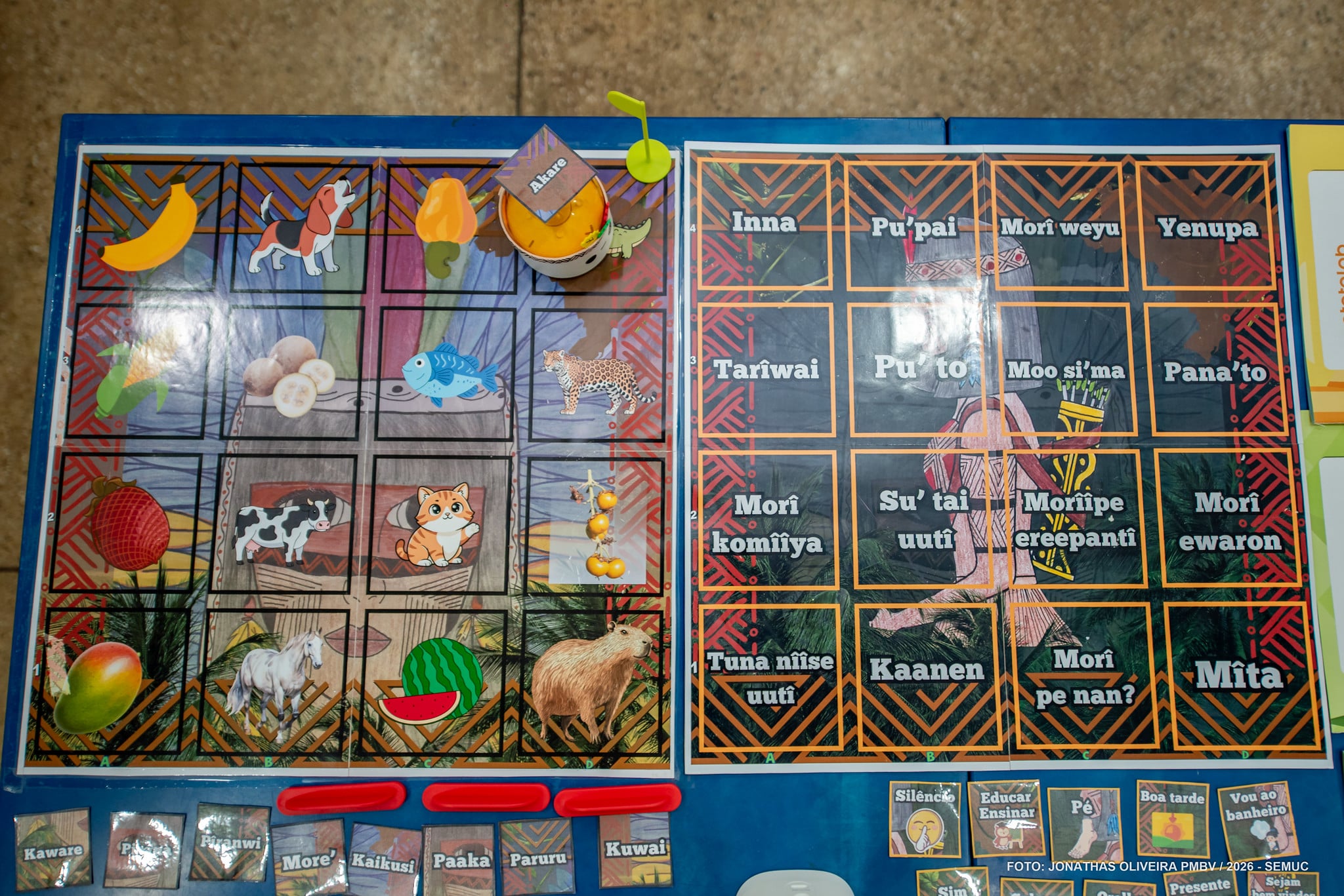 Além disso, expressões comuns da rotina escolar também fazem parte das atividades, como pedir para beber água, ir ao banheiro e responder à chamada, tudo na língua materna.