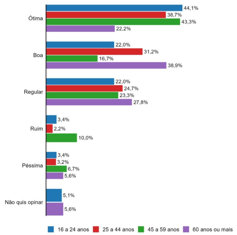 Os homens representam o maior percentual de avaliação “ótima” (45,5%). Desse público, 24,2% consideram a atual gestão como “boa” e “regular”, cada, 3% como “péssima” e 2% como “ruim”. Por outro lado, 1% não quis opinar.