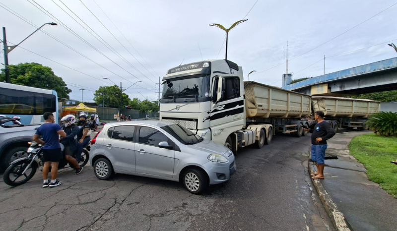Rotatória do São José fica travada após colisão entre carro e caminhão